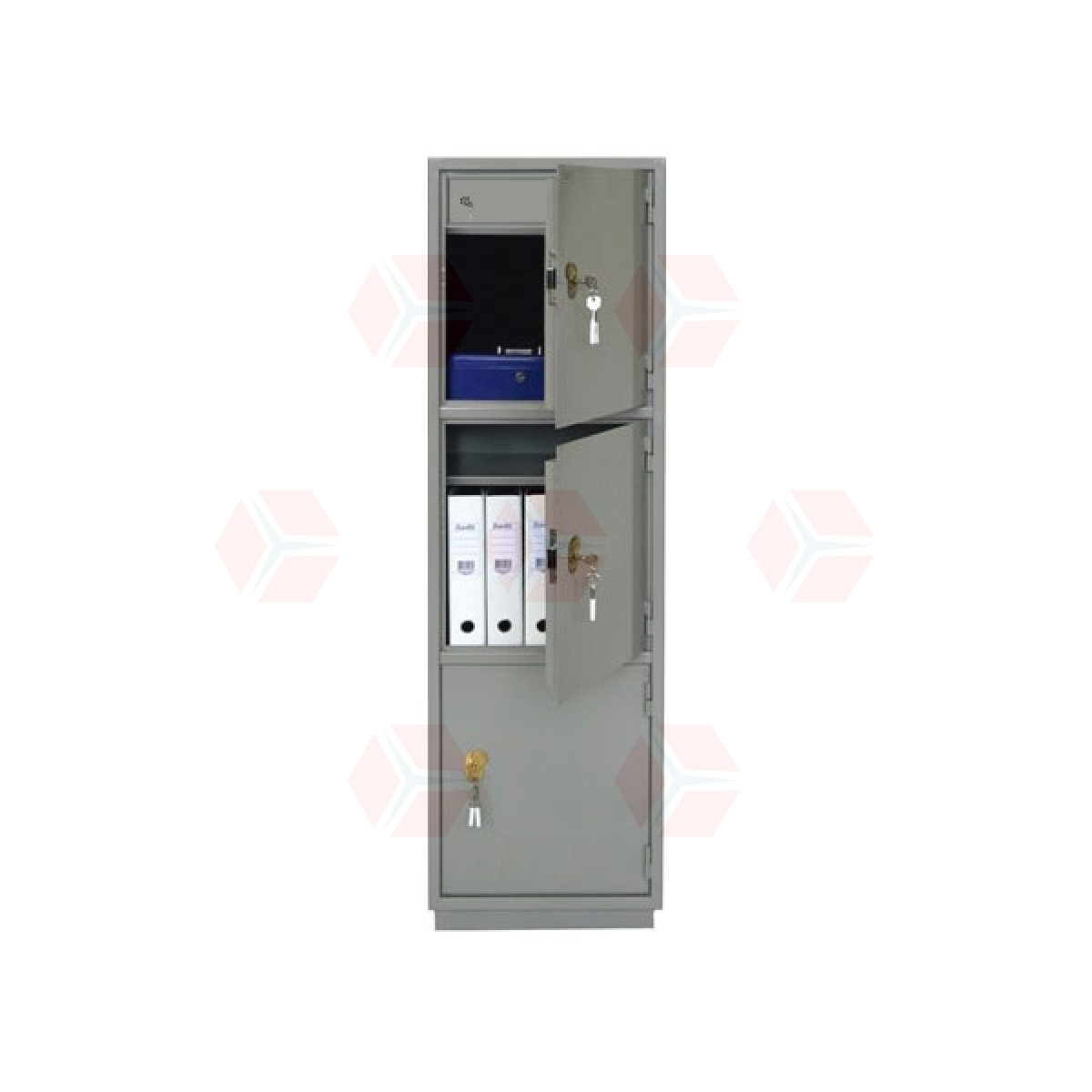 Шкаф представляет собой цельносварную металлическую конструкцию прямоугольной формы, соединение элементов которой выполнены методом сварки сплошным швом по контуру прилегания элементов. Корпус и дверь шкафа изготовлены из стального листа толщиной 1,5мм. Дверь изнутри усилена панелью коробчатого сечения из стального листа толщиной 0,8 мм. В двери шкафа установлен врезной 8-ми сувальдный замок фирмы «ПРО САМ» (Россия). Горизонтальная перегородка делит шкаф на 3 независимых отделения, запираемых собственной дверью. В верхнем отделении шкафа КБС-033т располагается отсек ограниченного доступа (трейзер), запираемый на замок «почтового» типа и 1 съемная регулируемая по высоте полка, а в среднем и нижнем отделении – по 1 съемной регулируемой по высоте полке. Шкаф КБС-033т комплектуется 3-мя съемными регулируемыми по высоте полками. Шкаф имеет подиум (подставку) высотой 47 мм для возможности размещения его вплотную к стене. Петли шкафа – внутренние. Окраска — полимерное порошковое покрытие, цвет серый.